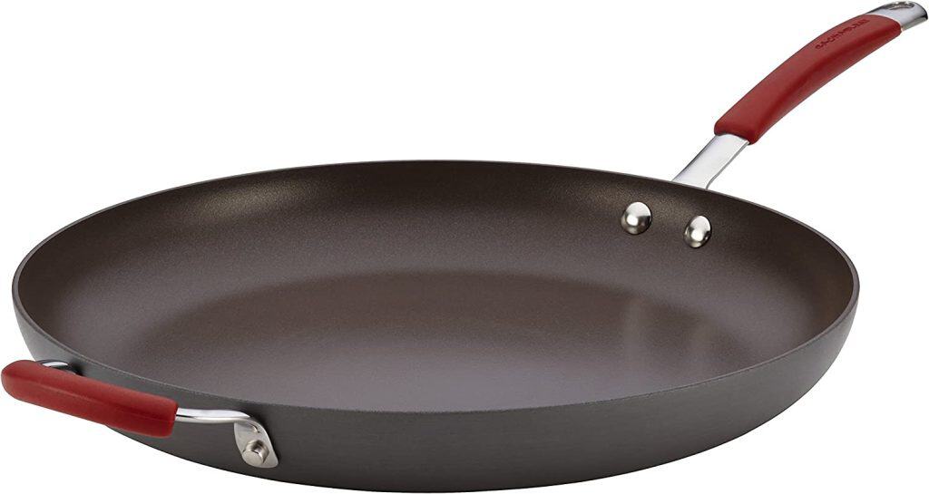 The Rachael Ray Cucina nonstick skillet is very useful in cooking because it has an excellent quality of the material. This pan is made from hard anodized aluminum which is very durable and sturdy.