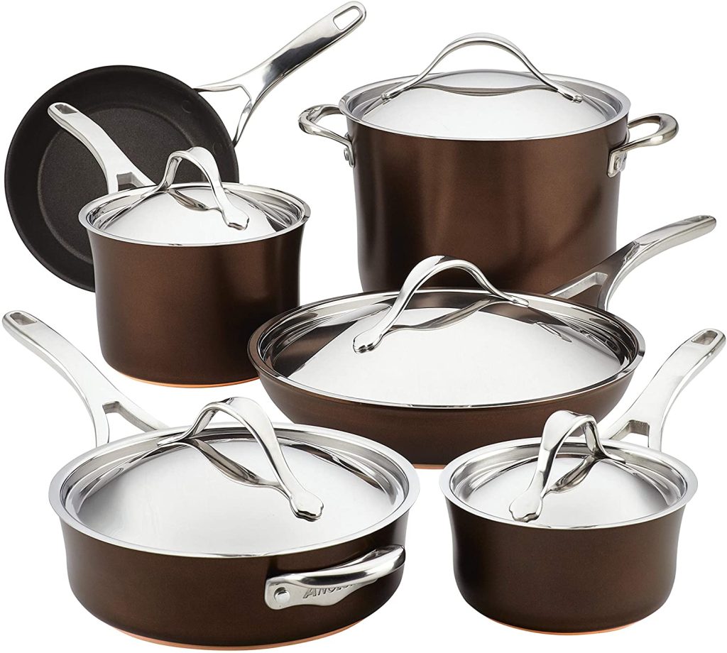 The Anolon Advanced Bronze Hard-Anodized Nonstick Cookware Set is the most popular set of Anolon cookware. It features a copper-bonded base, which means that food won’t stick to it. Because of this, it’s oven- and broiler-safe, but don’t put it in the dishwasher. This is because it has a copper core.