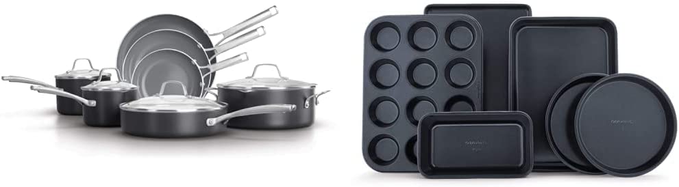 This set of cookware from GreenLife includes all the pots and pans you will need for your daily cooking routine. The lightweight aluminium and ceramic non-stick coating of the pots and pans ensure even heat distribution. These are made of heavy-gauge aluminium and are easy to clean. The set is dishwasher safe and also comes with a guarantee. You can purchase the complete set for about $120.