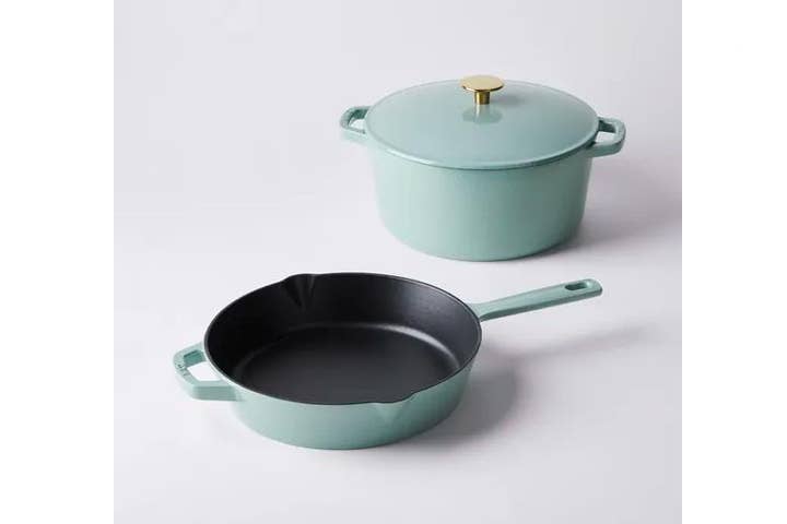 Cast iron has a reputation for being incompatible with glass top stoves, but with a few precautions, it’s definitely doable. While rough cast iron can scratch the stove top if it’s slid around or dropped onto it, Kana’s enameled cast iron is smooth enough to use without trouble (though you’ll still want to be careful when moving or setting down the pan). Available in a rainbow of colors, the cookware looks sleek and modern but maintains the durability of traditional cast iron. Plus, each piece is made from 40 percent recycled cast iron that would otherwise wind up in landfills. The pots and pans are pre-seasoned and don’t require additional seasoning, but you can rub a drop of oil along the rim before storing for extra care. Though the brand states that their cast iron is both oven- and dishwasher-safe, we recommend hand-washing to preserve the enamel and prevent the paint from chipping.