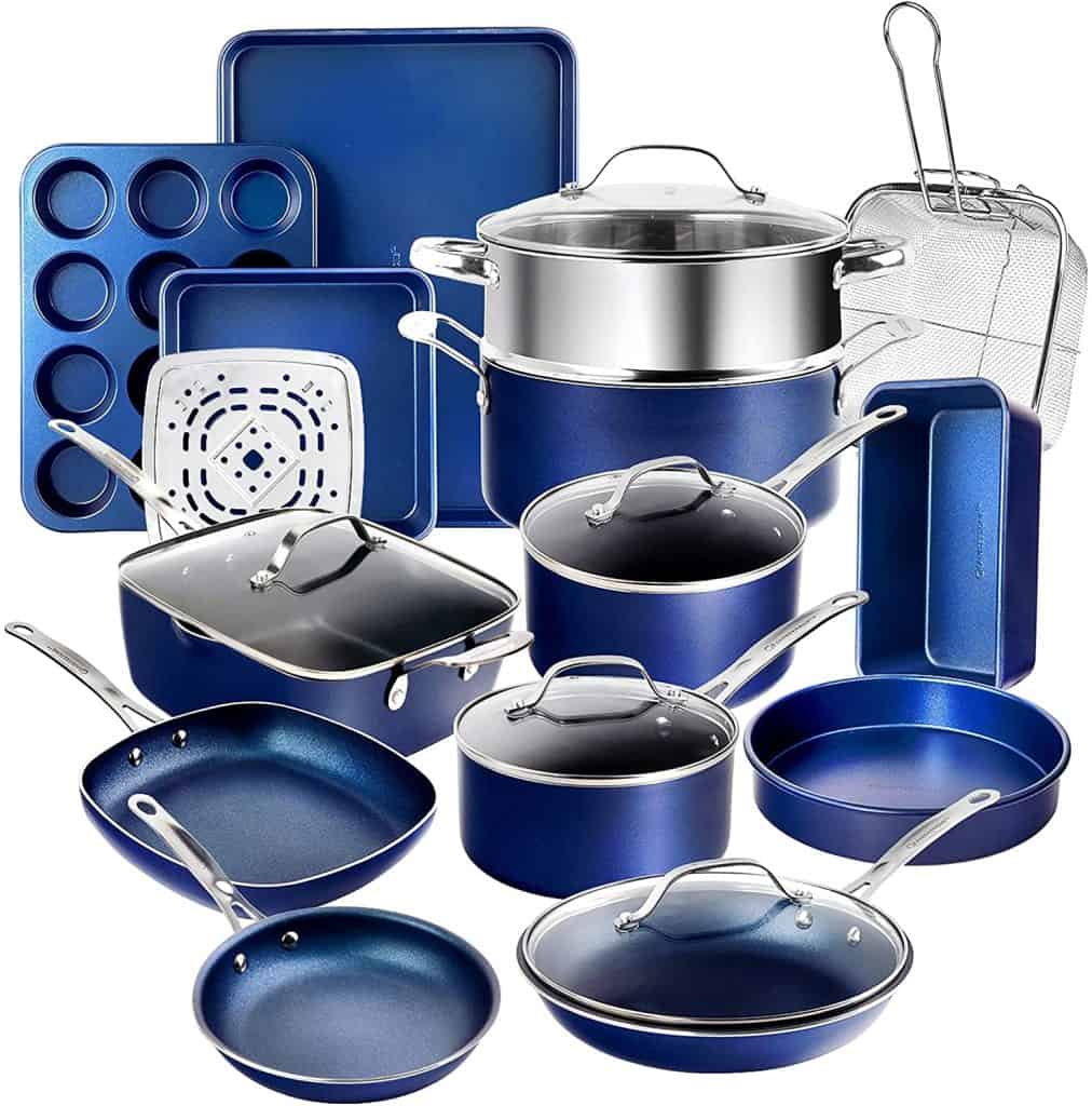 T-fal’s flat bottomed, aluminum-made pots and pans are ideal for non-stick cooking. The aluminum construction and glass lids will keep moisture and delicious flavors inside without having to remove the lid. All T-fal pots and pans are dishwasher-safe. The 17-piece set is also the cheapest in our list. We recommend the T-fal 17-piece set if you’re on a budget.