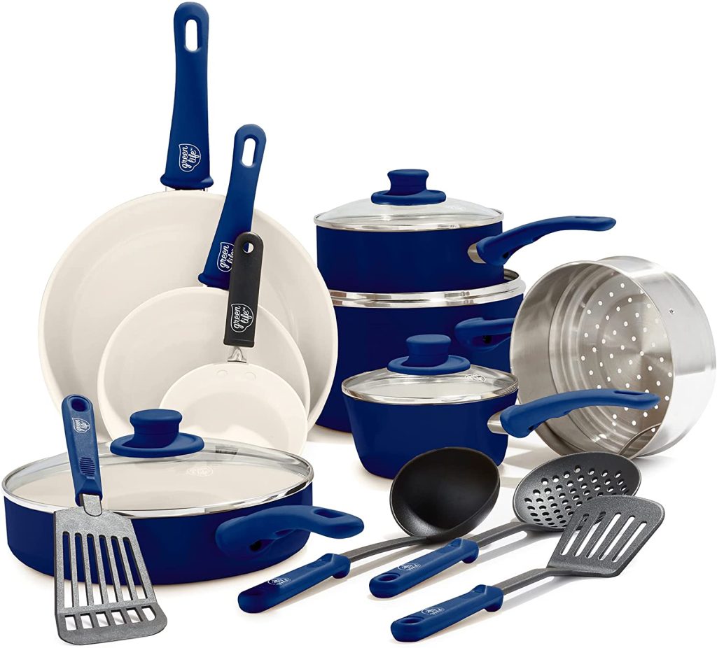 The GreenLife Soft Grip Healthy Ceramic Nonstick cookware set has the surface of a nonstick ceramic and comes in a selection of bright colors.