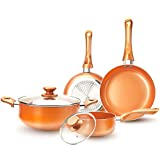 Kutime’s six-piece nonstick cookware set is budget-friendly and compatible. The exclusive copper color set comprises two frying pans, two glass lids, a milk pan, and a stockpot. They have a premium ceramic coating free from PTFE, PFOA, lead, and cadmium. The cookware is equipped with a fast heat conduction base that will ensure even distribution of heat and fast cooking.