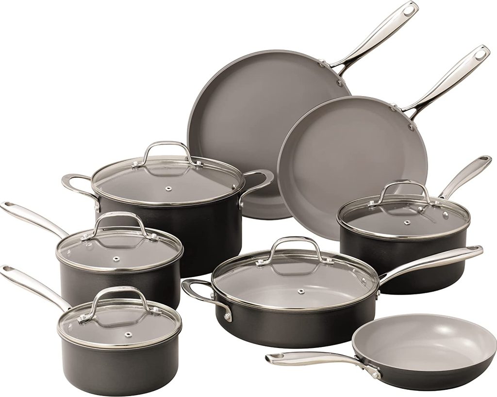The diamond-hard coating means that these pieces can be used in tandem with metal utensils, whisks, and electric beaters. That comes in especially handy when the stock pot or larger saucepans are used to make side dishes like whipped potatoes.