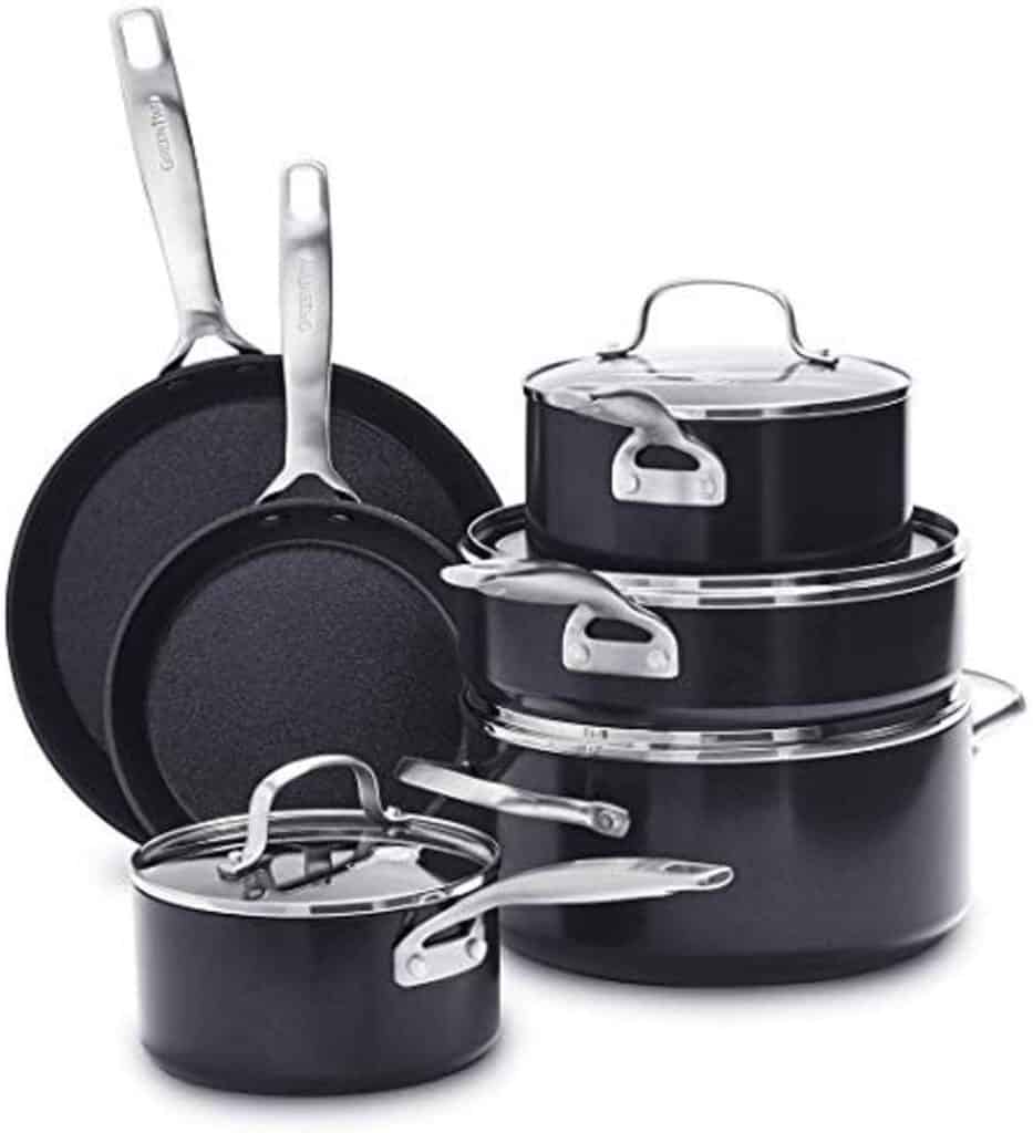 The Scanpan Classic line is a great option for those on a budget. This line features non-stick, durable ceramic coating. It is also oven-safe up to 500 degrees F. Its nonstick surface makes removing food stains a breeze. The set also features a stainless steel steamer and four bamboo tools. The greenware set is dishwasher and oven safe. It is made from recycled aluminum and is free of PFA and lead.