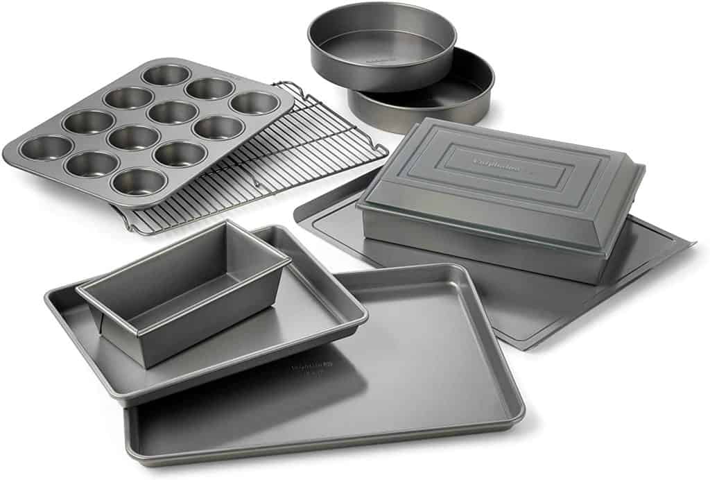 This Circulon bakeware set is a versatile and durable set. Each piece is crafted of heavy gauge steel for even heating, and the rolled-rim design has wide handles for easy handling. There are also two round cake pans and a square one for sheet cakes. The set also includes a covered rectangular cake pan that is perfect for weekend frittatas and baked casseroles. A nonstick cooling rack fits inside the cookie sheet for easy cleanup.