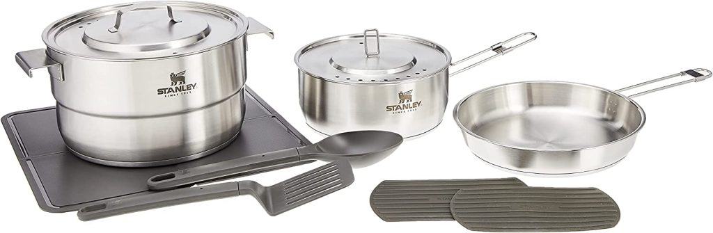 If you’re looking for a set that will stand up to the elements, you might want to consider the Stanley cookware set. It includes a large pot and a frying pan. This set is great for making bacon or grilling rainbow trout. It is made of multi-layer material and is designed for backpacking stoves.