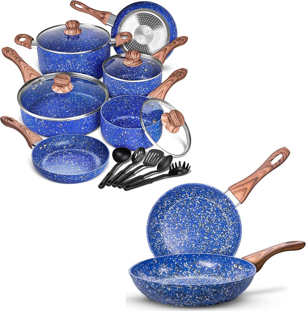 The set includes two fry pans, three saucepans with lids, a stockpot with lid, as well as a solid spoon, and a slotted spatula. The nonstick protective layer shouldn’t react to acidic foods, either, making it safe for cooking sauces like marinara or lemon-garlic butter sauce.