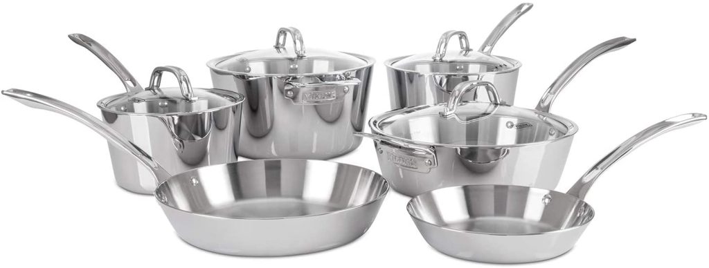 The Viking Tri-ply Set, rated 4.6 out of 5 stars, is the most affordable set. While the set doesn’t come with a glass lid, it is still good enough to impress most cooks.